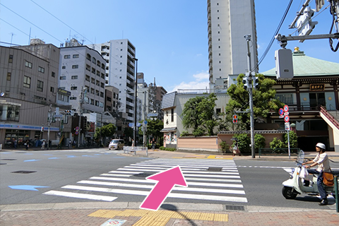 エレベーターで地上に出た方は右へ、エスカレーターで地上に出た方は真っ直ぐ進むと、「羅漢寺」というお寺が見えます。その羅漢寺前の交差点(歩道)を渡ってください。