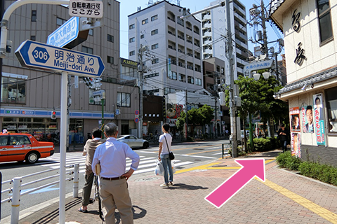 交差点を渡ったら、羅漢寺を右手にして、まっすぐ(明治通り沿いを)進みます。