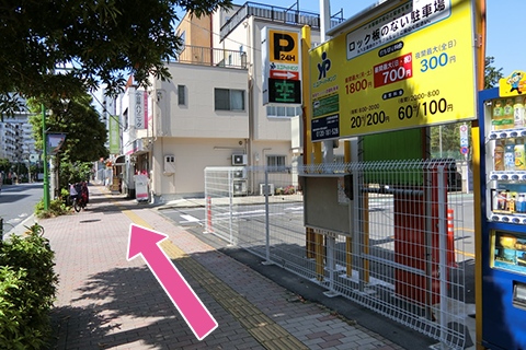右手に見えるコインパーキングも通過してください。(お車で来られる場合はこちらの駐車場がオススメです。)