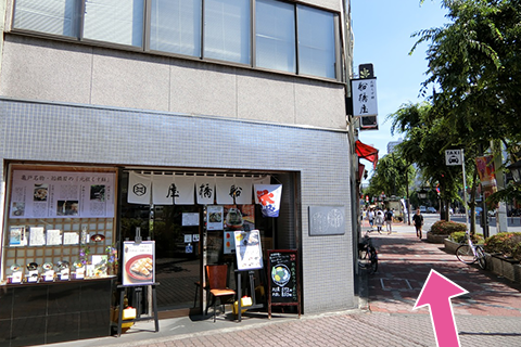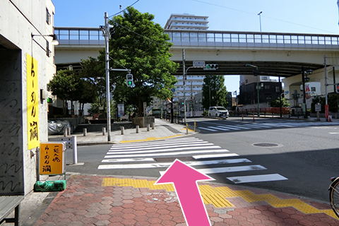 歩道橋をまっすぐ進んでください。「七福セールズ」前の階段を降ります。(階段の左隣にエレベーターもございます。)