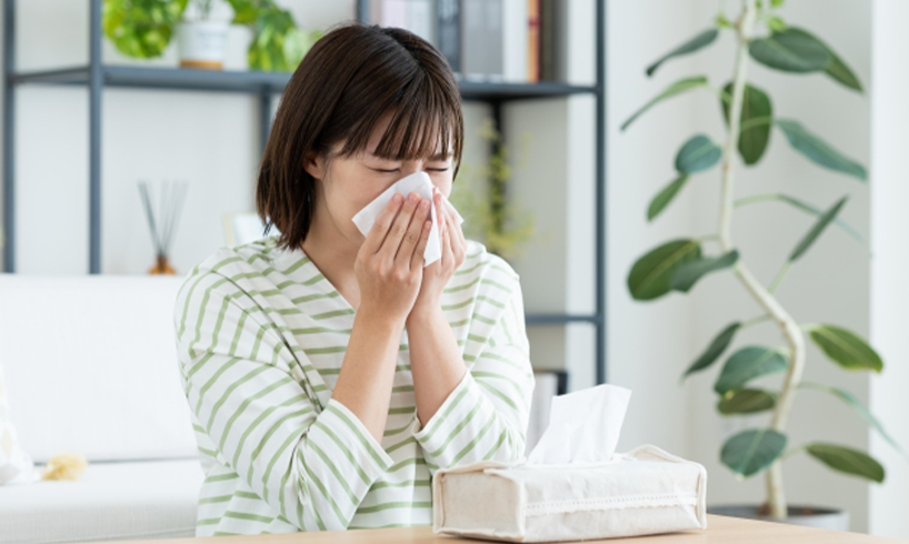 花粉症の主な症状は、鼻の三大症状(くしゃみ、鼻水、鼻づまり)と目の三大症状(目のかゆみ、充血、涙)です。また、のどの痛みやかゆみ、皮膚のかゆみ、下痢、熱っぽい感じなどの全身症状を伴うこともあります。
